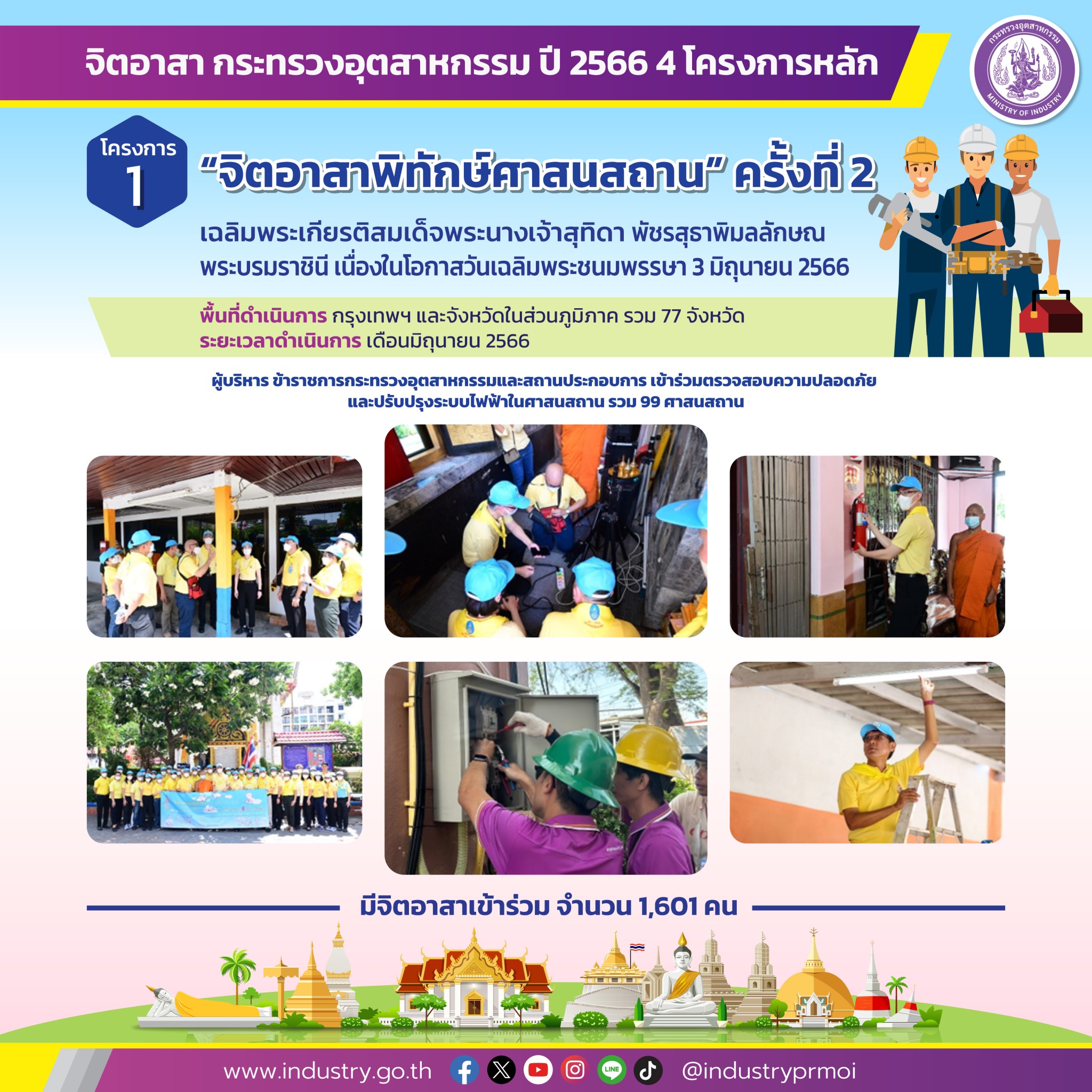 "จิตอาสาพิทักษ์ศาสนสถาน" ครั้งที่ 2 เฉลิมพระเกียรติสมเด็จพระนางเจ้าสุทิดา พัชรสุธาพิมลลักษณ พระบรมราชินี เนื่องในโอกาสวันเฉลิมพระชนมพรรษา 3 มิถุนายน 2566 โดยผู้บริหาร ข้าราชการกระทรวงอุตสาหกรรม และสถานประกอบการเข้าร่วมตรวจสอบความปลอดภันและปรับปรุงระบบไฟฟ้าในศาสนสถาน