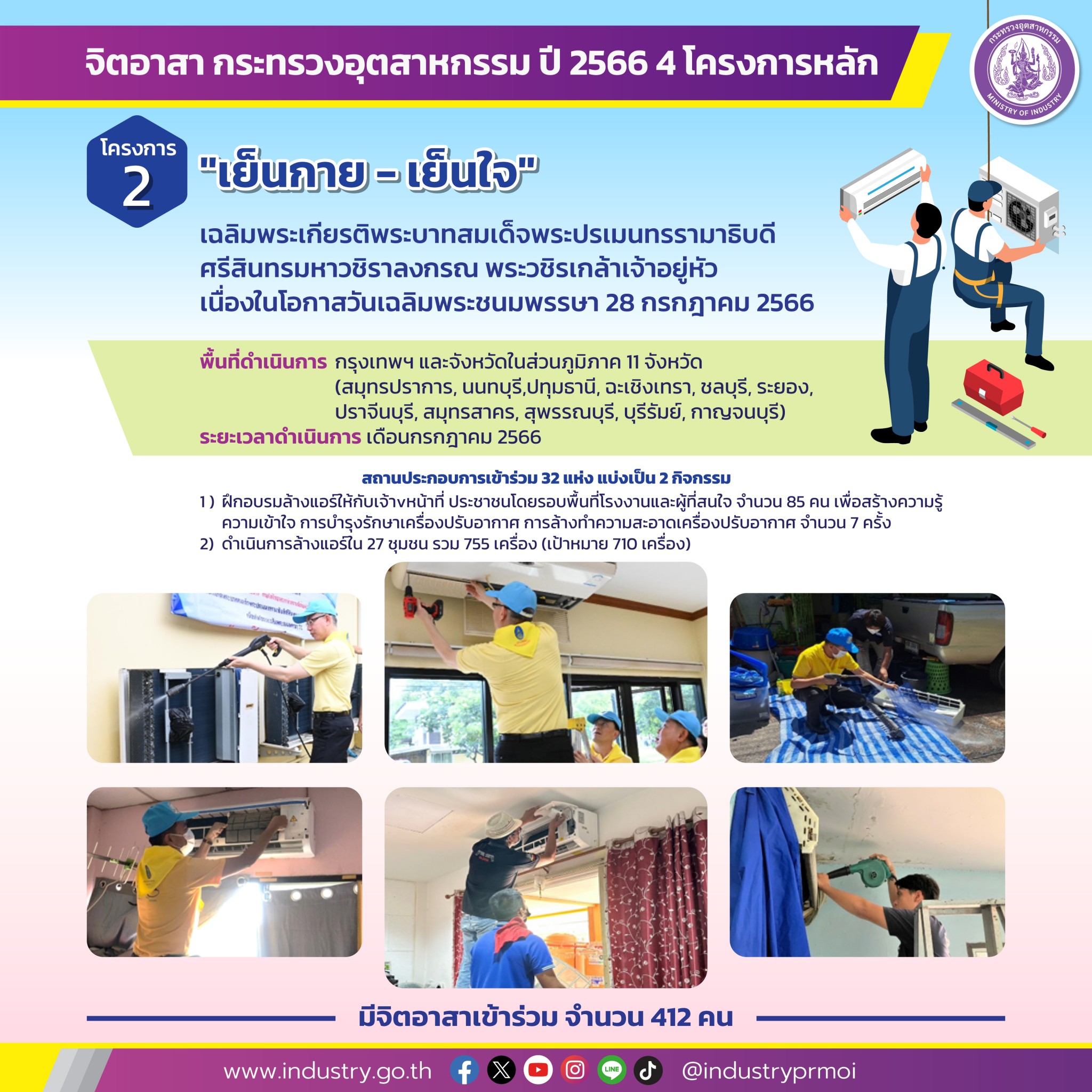 "เย็นกาย - เย็นใจ" เฉลิมพระเกียรติพระบาทสมเด็จพระปรเมนทรรามาธิบดี ศรสินทรมหาวชิรลงกรณ พระวชิรเกล้าเจ้าอยู่หัว เนื่องในโอกาสวันเฉลิมพระชนมพรรษา 28 กรกฎาคม 2566 โดยผู้บริหาร ข้าราชการกระทรวงอุตสาหกรรม และสถานประกอบการเข้าร่วม 32 แห่ง แบ่งเป็น 2 กิจกรรม