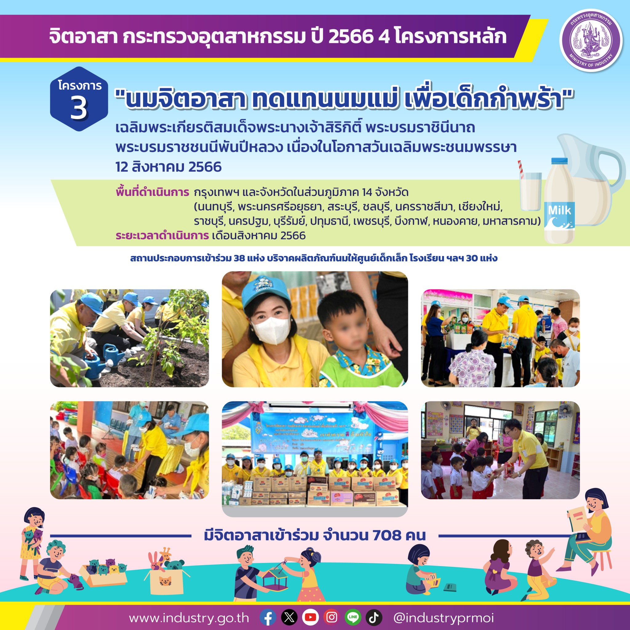 "นมจิตอาสา ทดแทนนมแม่ เพื่อเด็กกำพร้า" เฉลิมพระเกียรติสมเด็จพระนางเจ้าสิริกิติ์ พระบรมราชินีนาถ พระบรมราชชนนีพันปีหลวง เนื่องในโอกาสวันเฉลิมพระชนมพรรษา 12 สิงหาคม 2566 โดยผู้บริหาร ข้าราชการกระทรวงอุตสาหกรรม และสถานประกอบการเข้าร่วม 38 แห่ง บริจาคผลิตภัณฑ์นมให้ศูนย์เด็กเล็ก โรงเรียน ฯลฯ 30 แห่ง