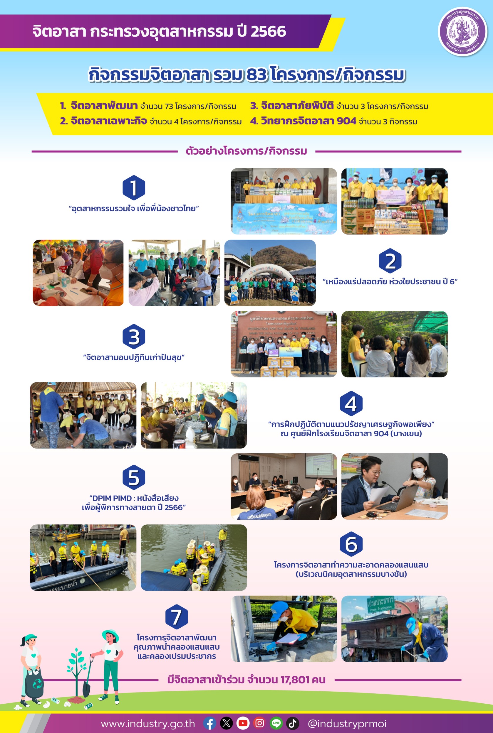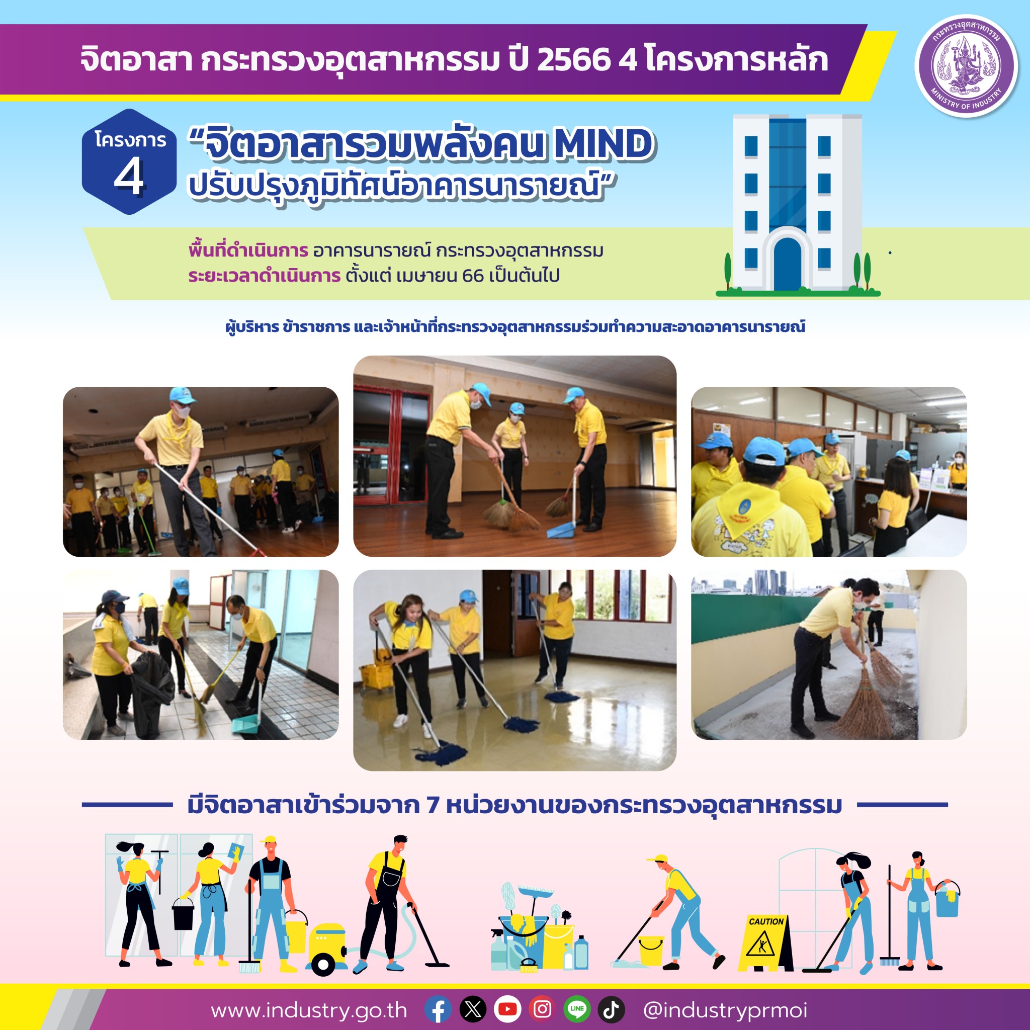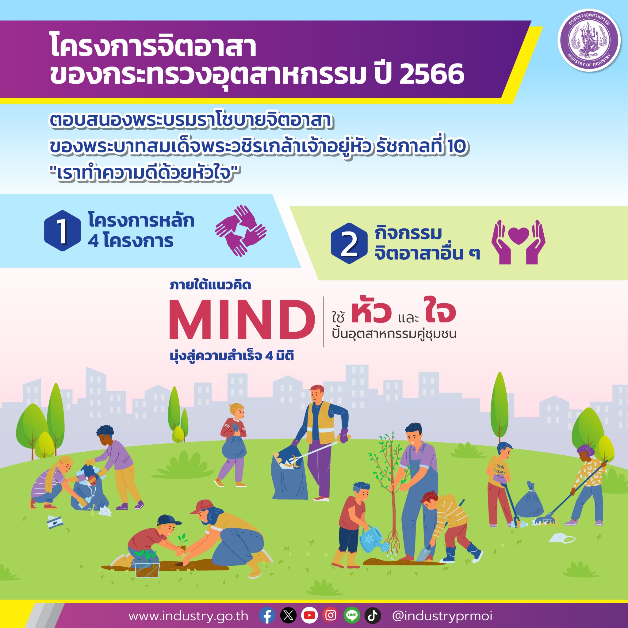โครงการจิตอาสาของกระทรวงอุตสาหกรรม ปี 2566 ตอบสนองพระบรมราโชบายจิตอาสาของพระบาทสมเด็จพระวชิรเกล้าเจ้าอยู่หัว รัชกาลที่ 10 “เราทำความดีด้วยหัวใจ” แบ่งเป็น 2 โครงการ/กิจกรรม ภายใต้แนวคิด “MIND” ใช้ “หัว” และ “ใจ” ปั้นอุตสาหกรรมคู่ชุมชน มุ่งสู่ความสำเร็จ 4 มิติ ผ่านการเชิญชวนสถานประกอบการอุตสาหกรรมร่วมดำเนินงานจิตอาสา เพื่อปลูกจิตสำนึกต่อสาธารณะ ปลูกฝังจิตใจให้บุคคลมีความรับผิดชอบต่อสังคม และร่วมมือกันทำประโยชน์เพื่อส่วนรวม ให้อุตสาหกรรมอยู่ร่วมกับประชาชนได้อย่างยั่งยืน