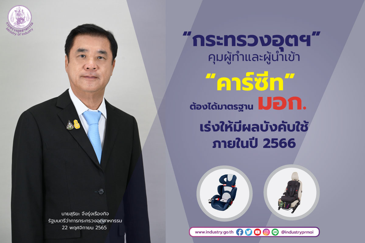 นายสุริยะ จึงรุ่งเรืองกิจ รัฐมนตรีว่าการกระทรวงอุตสาหกรรม เปิดเผยว่า มติการประชุมคณะกรรมการมาตรฐานผลิตภัณฑ์อุตสาหกรรม (กมอ.) เมื่อวันที่ 14 พฤศจิกายน 2565 ที่ผ่านมา เห็นชอบให้คาร์ซีท หรือที่นั่งนิรภัยสำหรับเด็ก ซึ่งเป็นอุปกรณ์เสริมใช้สำหรับให้เด็กนั่งโดยสารบนรถยนต์เพื่อเพิ่มความปลอดภัย เป็นสินค้าควบคุม เพื่อคุ้มครองความปลอดภัยแก่ประชาชนโดยเฉพาะเด็กเล็ก ซึ่งสอดคล้องตามภารกิจของกระทรวงอุตสาหกรรมด้านการคุ้มครองประชาชนให้ปลอดภัยจากการใช้สินค้าที่ได้มาตรฐาน โดยเตรียมออกกฎหมายเพื่อควบคุมให้ผู้ทำและผู้นำเข้าคาร์ซีททุกราย ต้องทำและนำเข้าเฉพาะคาร์ซีทที่ผ่านการทดสอบความปลอดภัยตามเกณฑ์มาตรฐาน มอก. เท่านั้นเพื่อยกระดับความปลอดภัยในการใช้รถใช้ถนน และเป็นตัวช่วยสำคัญในการตัดสินใจเลือกซื้อสินค้าของประชาชนผู้บริโภค
