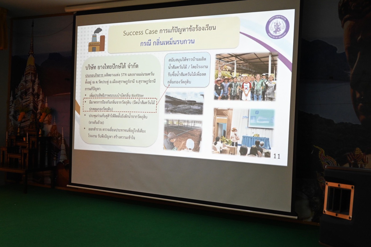 ทั้งนี้ ปลัดกระทรวงอุตสาหกรรม ได้มอบนโยบายให้ สอจ. มุ่งเน้นการดำเนินงานที่ตอบโจทย์การพัฒนาอุตสาหกรรม S-Curve ซึ่งเป็นเป้าหมายหลักของหน่วยงาน โดยในพื้นที่จังหวัดสุราษฎร์ธานี ถือได้ว่าเป็นแหล่งผลิตอุตสาหกรรมปาล์มน้ำมันที่สำคัญของไทย รวมถึงการกำกับดูแลโรงงานต่างๆ ไม่ให้ส่งผลกระทบต่อชุมชน ทั้งในด้านกลิ่น เสียง ควัน และน้ำเสีย โดยการกำหนดเงื่อนไขเป็นข้อบังคับของโรงงาน ทั้งนี้ ได้มอบหมายให้ผู้ตรวจราชการกระทรวงอุตสาหกรรม ช่วยกำกับดูแลการดำเนินงาน และบริหารจัดการบุคลากรของ สอจ.ทั่วประเทศ ให้มีความพร้อม มีศักยภาพ และกำหนดตัวชี้วัดที่เหมาะสมในแต่ละพื้นที่ ทั้งในเชิงปริมาณและคุณภาพ เพื่อให้บุคลากรมีแนวทางปฏิบัติได้อย่างถูกต้อง