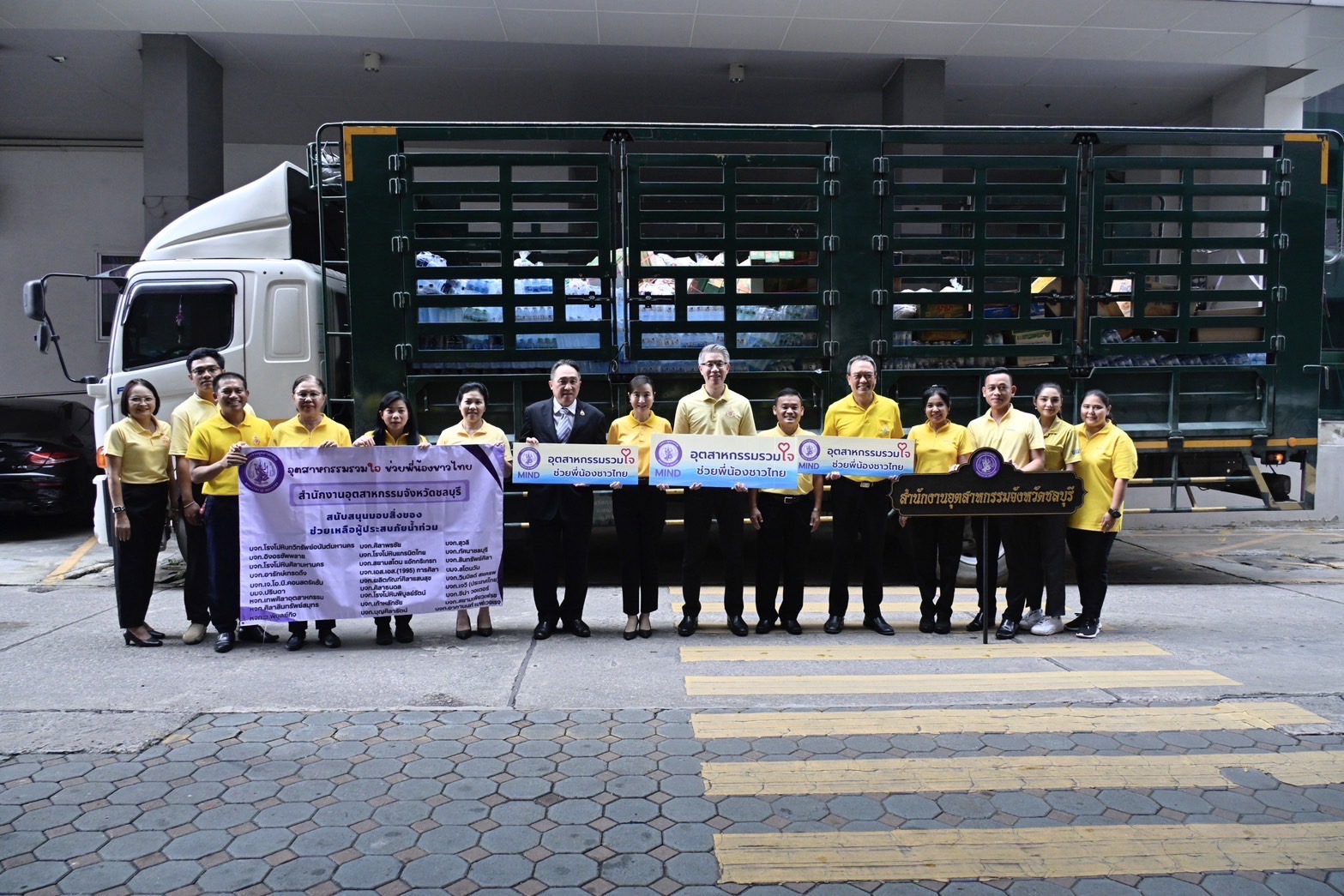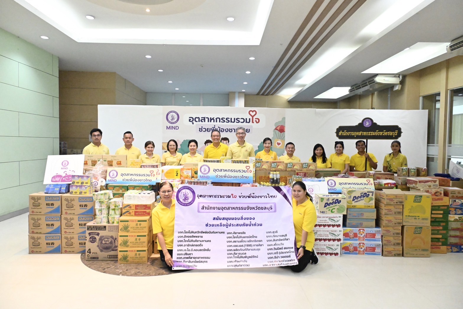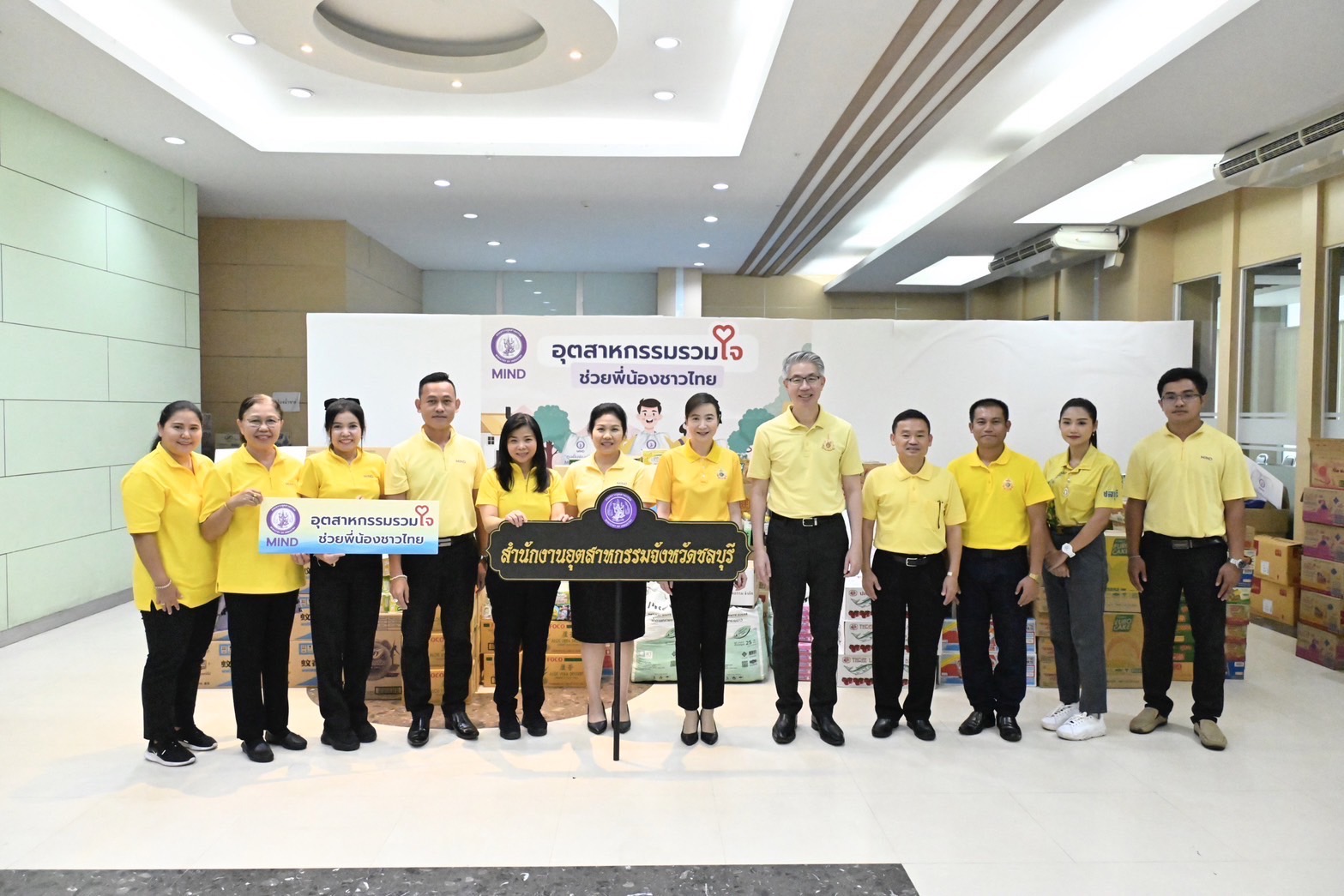 กระทรวงอุตสาหกรรม จึงได้ร่วมมือกับหน่วยงานภาครัฐ เอกชน ผู้ประกอบการโรงงานอุตสาหกรรมทั่วประเทศ เพื่อรวมใจส่งมอบรอยยิ้ม ให้กับประชาชน ภายใต้โครงการ “อุตสาหกรรมรวมใจ ช่วยพี่น้องชาวไทย” โดยในวันที่ 2 กันยายน 2567 ดร.ณัฐพล รังสิตพล ปลัดกระทรวงอุตสาหกรรม ได้รับมอบสิ่งของอุปโภค บริโภค และของใช้ที่จำเป็น เพื่อเตรียมแพคเป็น “ถุงยิ้มพิมพ์ใจ MIND ไม่ทิ้งกัน” เพื่อเป็นกำลังใจให้กับผู้ประสบอุทกภัย โดยได้รับการสนับสนุนจากสำนักงานอุตสาหกรรมจังหวัดชลบุรี ที่ได้รับความอนุเคราะห์ ข้าวสาร บะหมี่กึ่งสําเร็จรูป ปลากระป๋อง น้ำปลา ขนม และยารักษาโรค จากผู้ประกอบการ ได้แก่ บริษัท โรงโม่หินทวีทรัพย์อนันต์มหานคร จำกัด บริษัท ผลิตภัณฑ์ศิลาแสนสุข จํากัด บริษัท เอส.เอส.(1995) การศิลา บริษัท ปรินดา จํากัด บริษัท สุวลี จํากัด บริษัท อารักษ์เทรดดิ้ง จํากัด บริษัท สโตนวัน จํากัดบริษัท โรงโม่หินศิลามหานคร จํากัด บริษัท โรงโม่หินแกรนิตไทย จํากัด บริษัท โรงโม่หินพิบูลย์รัตน์ จํากัด บริษัท อิงอรซัพพลาย จํากัด บริษัท เจ.โอ.บี.คอนสตรัคชั่น จำกัด บริษัท ศิลาพรชัย จำกัด บริษัท สยามสโตน แอ๊กกริเกรท จำกัด ห้างหุ้นส่วนจำกัด ศิลาสินทรัพย์สมุทร บริษัท เก้าหลักชัย จำกัด ห้างหุ้นส่วนจำกัด ว.พิบูลย์กิจ บริษัท ทัศนาชลบุรี จำกัด บริษัท บุญศิลารัตน์ จำกัด บริษัท สินทรัพย์ศิลา จำกัด บริษัท ศิลาธนดล จำกัด ห้างหุ้นส่วนจำกัด ศิลาอุตสาหกรรม บริษัท อาภานนท์ เบฟเวเรจ จำกัด บริษัท ซีน่า วอเตอร์ จำกัด บริษัท สยามเพียวเฟรช จำกัด และบริษัท วินมิลด์ สแครพ จำกัด