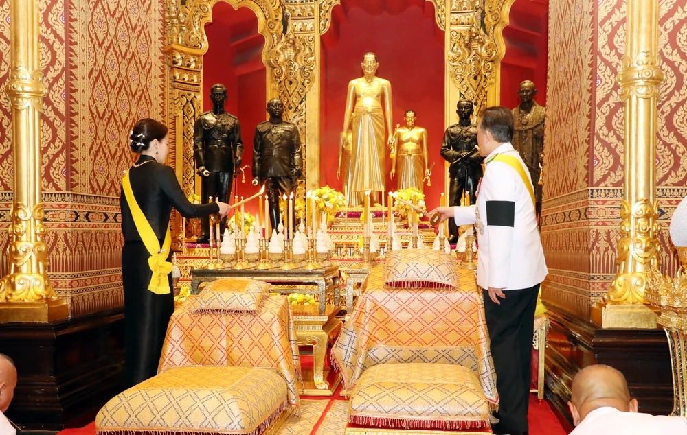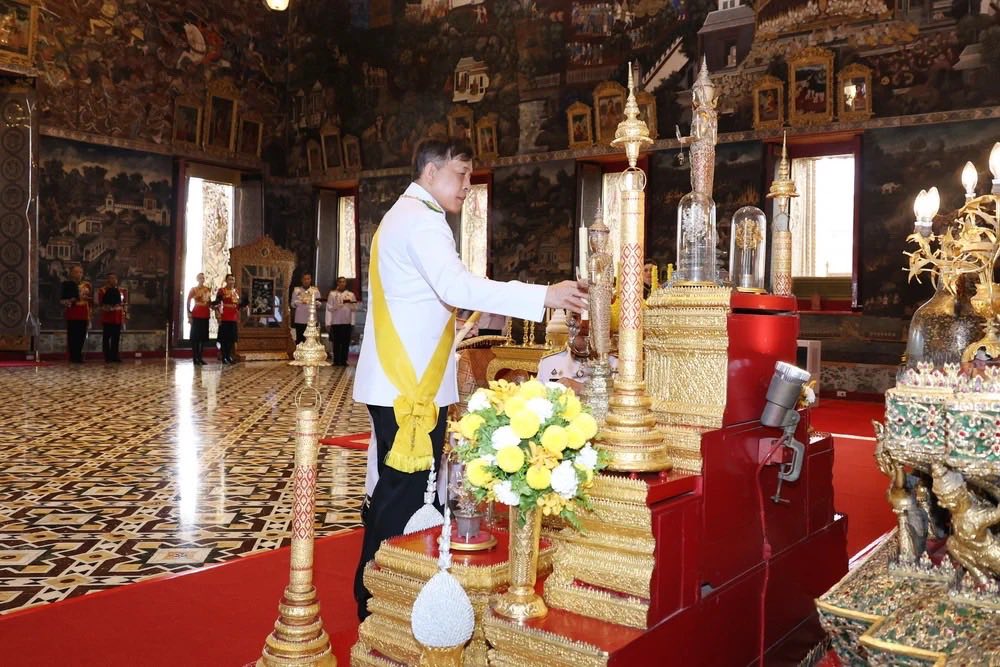 จากนั้น เสด็จออกจากพระอุโบสถ เสด็จพระราชดำเนินไปยังปราสาทพระเทพบิดร พระบาทสมเด็จพระเจ้าอยู่หัว ทรงจุดธูปเทียนเครื่องราชสักการะทองลงยาราชาวดี และทรงจุดธูปเทียนเครื่องทองน้อย ทรงกราบถวายบังคมพระบรมรูปสมเด็จพระบูรพมหากษัตริยาธิราช สมเด็จพระนางเจ้า ฯ พระบรมราชินี ทรงจุดธูปเทียนเครื่องราชสักการะทองลงยารอง และทรงจุดธูปเทียนเครื่องทองน้อย ทรงกราบถวายบังคมพระบรมรูปสมเด็จพระบูรพมหากษัตริยาธิราช เสร็จแล้ว เสด็จออกจากปราสาทพระเทพบิดร ไปประทับรถยนต์พระที่นั่ง เสด็จพระราชดำเนินกลับ